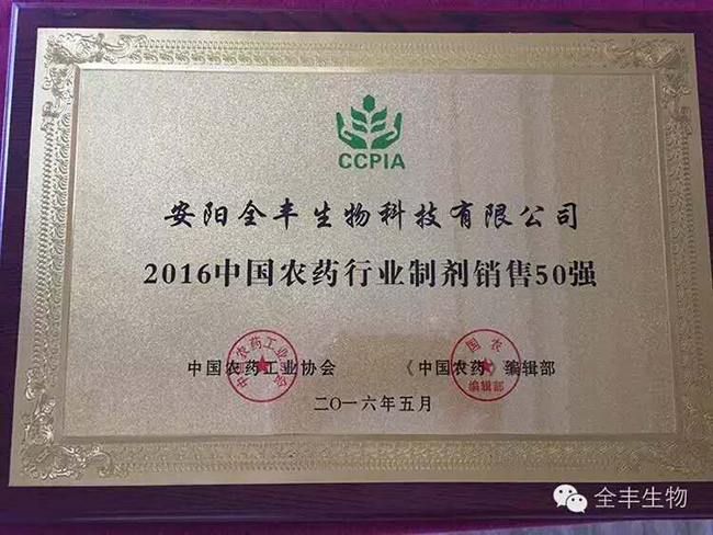 熱烈祝賀安陽(yáng)全豐榮獲2016中國(guó)農(nóng)藥行業(yè)制劑銷售50強(qiáng)企業(yè),矮腳虎獲得2015年中國(guó)植保市場(chǎng)植物生長(zhǎng)調(diào)節(jié)劑暢銷品牌產(chǎn)品