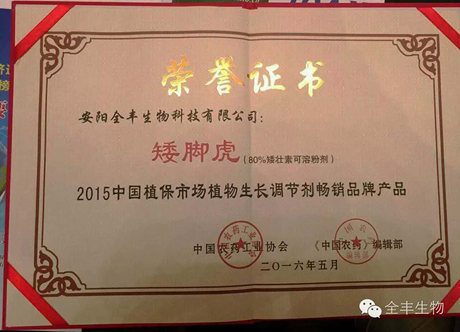 同時(shí),安陽(yáng)全豐“矮腳虎?” 榮獲2015年中國(guó)植保市場(chǎng)植物生長(zhǎng)調(diào)節(jié)劑暢銷品牌產(chǎn)品!