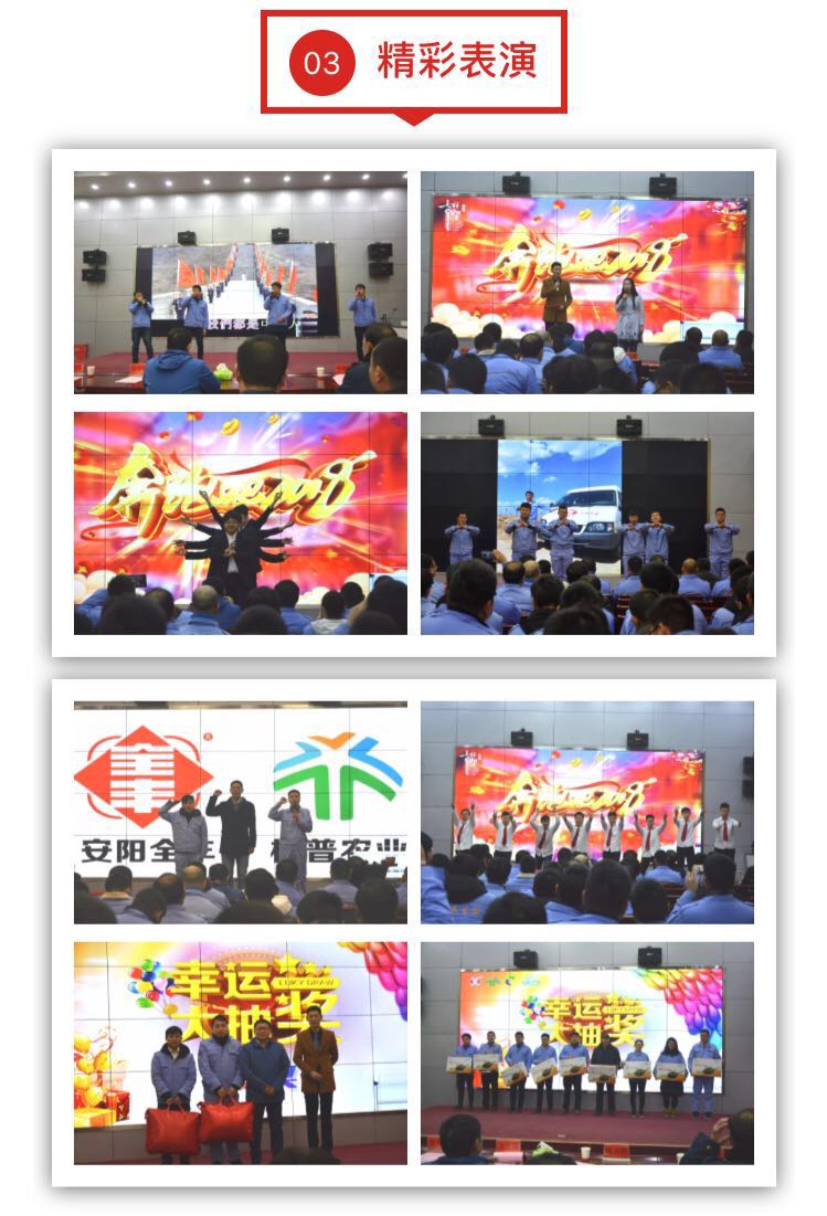 隆重的總結(jié)表彰活動(dòng)結(jié)束后,以“奔跑吧2018”為主題的聯(lián)歡會(huì)拉開序幕。原藥分公司的一曲《我是中國人》唱出了全豐人的豪邁,太行培訓(xùn)學(xué)校表演的舞蹈《舞動(dòng)青春》和制劑分公司表演的《新春舞會(huì)》有異曲同工之妙,博得現(xiàn)場陣陣掌聲,標(biāo)普公司表演的小品《我是飛行員》把一個(gè)失戀青年加入飛防隊(duì)伍后的徹底蛻變刻畫得惟妙惟肖。飛防隊(duì)的小伙子們也帶來驚喜,太極拳表演柔中帶剛、虎虎生威,生產(chǎn)技術(shù)部的男女聲獨(dú)唱和財(cái)務(wù)部的二胡表演各具特色,活動(dòng)現(xiàn)場的幸運(yùn)抽獎(jiǎng)環(huán)節(jié)更是讓現(xiàn)場歡呼聲和掌聲此起彼伏。歡笑聲中,全豐人告別了2017年,2018年我們攜手并進(jìn),再創(chuàng)輝煌!全豐人贏戰(zhàn)2018!加油干!