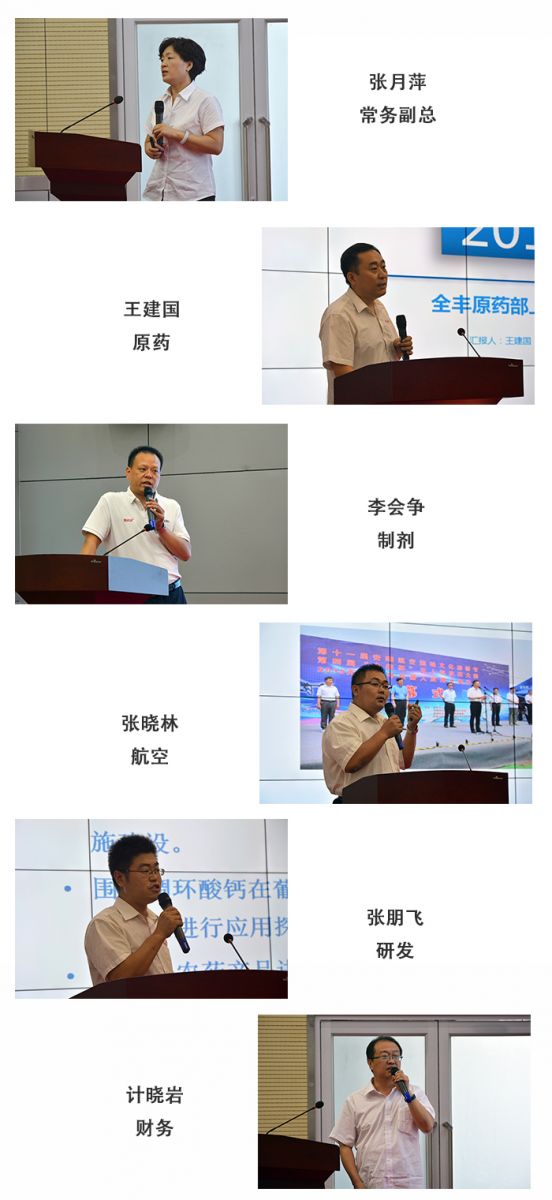 在述職環(huán)節(jié),原藥、制劑、航空、研發(fā)、財務(wù)、綜合等各分公司和部門第 一責任人依次進行述職報告。原藥、制劑、航空還針對各自部門的銷售業(yè)務(wù)取得成績和團隊建設(shè)等方面詳細進行分析。